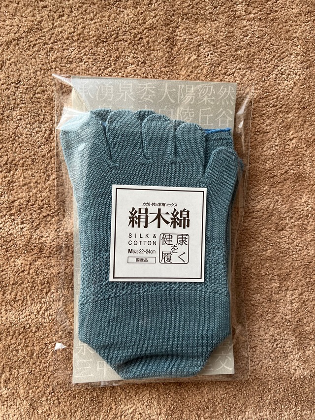 【くつ下】大法紡績・絹木綿〜カカト付5本指ソックス〜 サイズ M:22~24cm/ブルー フィット感を重視する冷えとり実践者に長く愛用されているこの絹木綿。 現在の大法紡績(靴下の会社)の原点ともいえる定番商品です。かかとがついている形のため、足にぴったりフィットし、靴の中でもズレません。裏側のシルクは、汗とともに体内の老廃物(毒素)を吸収して排出。表側のコットンは、シルクが放出した湿気と老廃物を吸い、シルクによる心地よさを保ちます。 この基本の5本指タイプは型くずれしにくく、カラーバリエーションも豊富です。 〈azuコメント〉 健康や快適さを大切にしたい方におすすめのカカト付き5本指ソックスです。健康思考のお客様のリピート率が高い商品です。 ぴったり足にフィットし、締め付けないし、たるまない。足指のストレスがなく、とにかく気持ちいい。5本指ジプシーの方にぜひ、使っていただきたい!全てこの靴下に替える方も多いです。 毎日の生活にプラスして、是非お試しください。 ※サイズはあくまで目安であり、個人差がありますのでご了承ください。 私は、足24.5センチでMサイスを履いています。 サイズ 男女共用M:22~24cm 色:ブルー 素材 裏面:絹100%/表面:綿100%(特殊弾性糸使用)